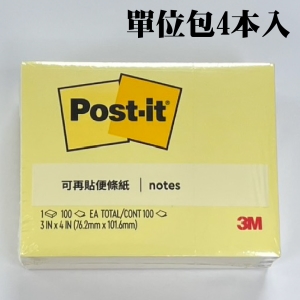 3M Post-it 可再貼便條紙 657-4PK 76.2x101.6mm 4入 黃
