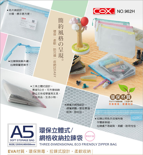 ‧EVA環保立體網格拉鍊袋係列產品,以EVA材質製成,環保安全無毒,不含塑化劑 ,友善環境,愛護地球 。